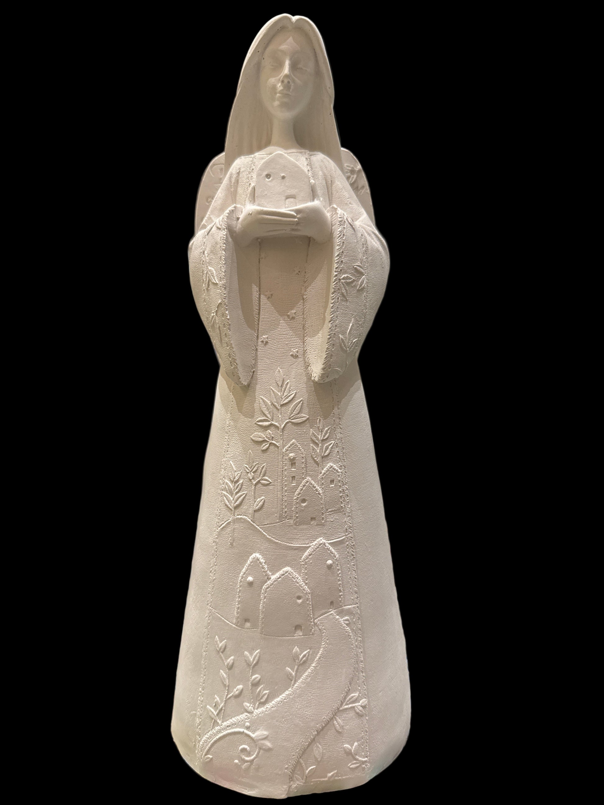 Escultura en escayola blanca con alto nivel de detalle. El ángel sostiene una casita y luce relieves de naturaleza y viviendas. En el reverso de las alas está grabada la oración “Bendice este Hogar”. Lista para exhibir o pintar.